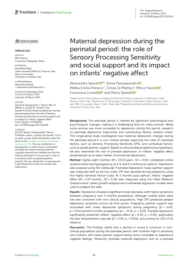 - Ana makale: Sperati, A., Passaquindici, I., Persico, M. E., Di Matteo, C., Fasolo, M., Lionetti, F., & Spinelli, M. (2025). Maternal depression during the perinatal period: the role of Sensory Processing Sensitivity and social support and its impact on infants’ negative affect. Frontiers in Psychology, 16, 1551016.